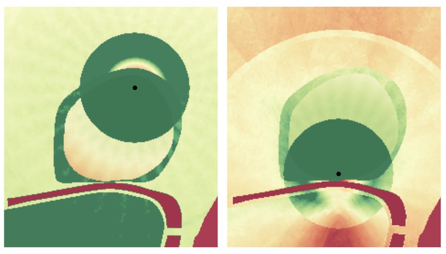 Now I show why I made this hole as wide as I did. All this width is a perfect way to illustrate that simply by changing the hole location a little bit, we can reveal significantly outsized effects in the optimal position and strategy. Since the hole is symmetric and we know the player should probably be on the right side, when we change the hole location to the opposite side of the boomerang green, we already know the player will prefer all that space on the left side.3