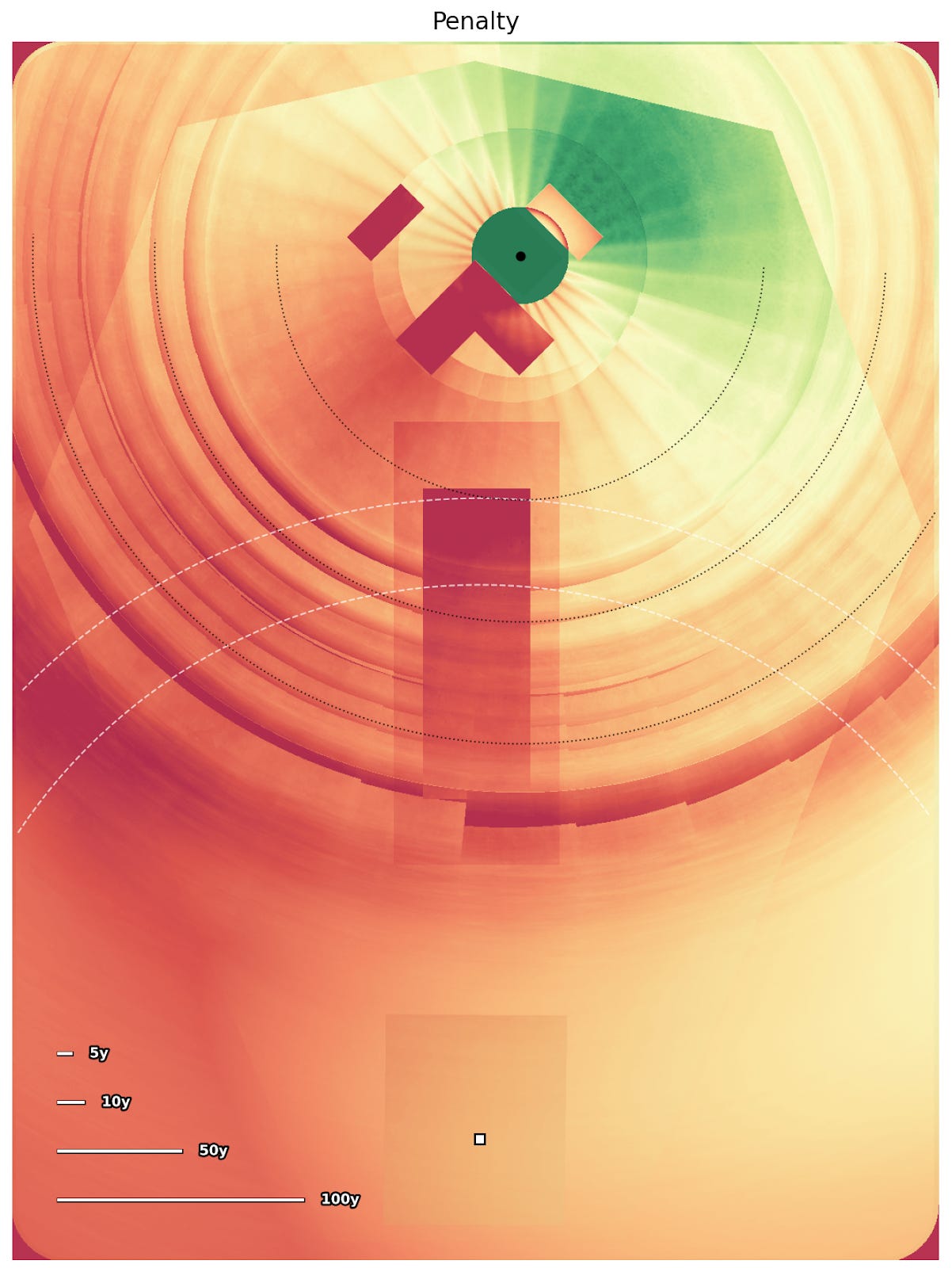 I thought about calling it a “strategic map,” but that seems wrong, because it shows penal influences just as much as strategic influences. I’ve thought about just calling it a “penalty map,” but again, the map is only useful at illustrating “strategic golf architecture” and not really good for showing “penal architecture.”