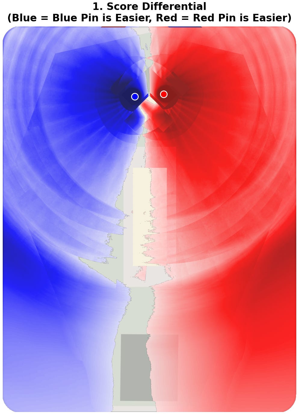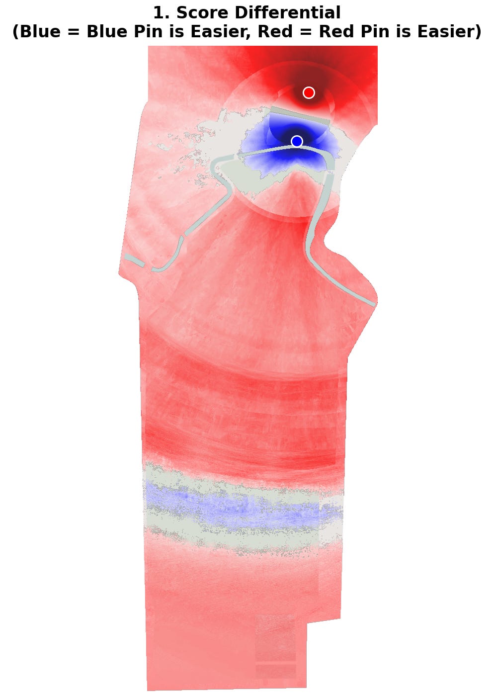 This close-up image shows us one of the few areas where it’s easier to reach the blue hole location than the red one. What’s important to note, though, is that this map still takes distance into account. We can actually filter that out though if we want to see the impact of the architecture alone. When we compare the strokes-to-hole penalty – netting the two Schoolfield maps below – then we have a similar result, but with some important differences.