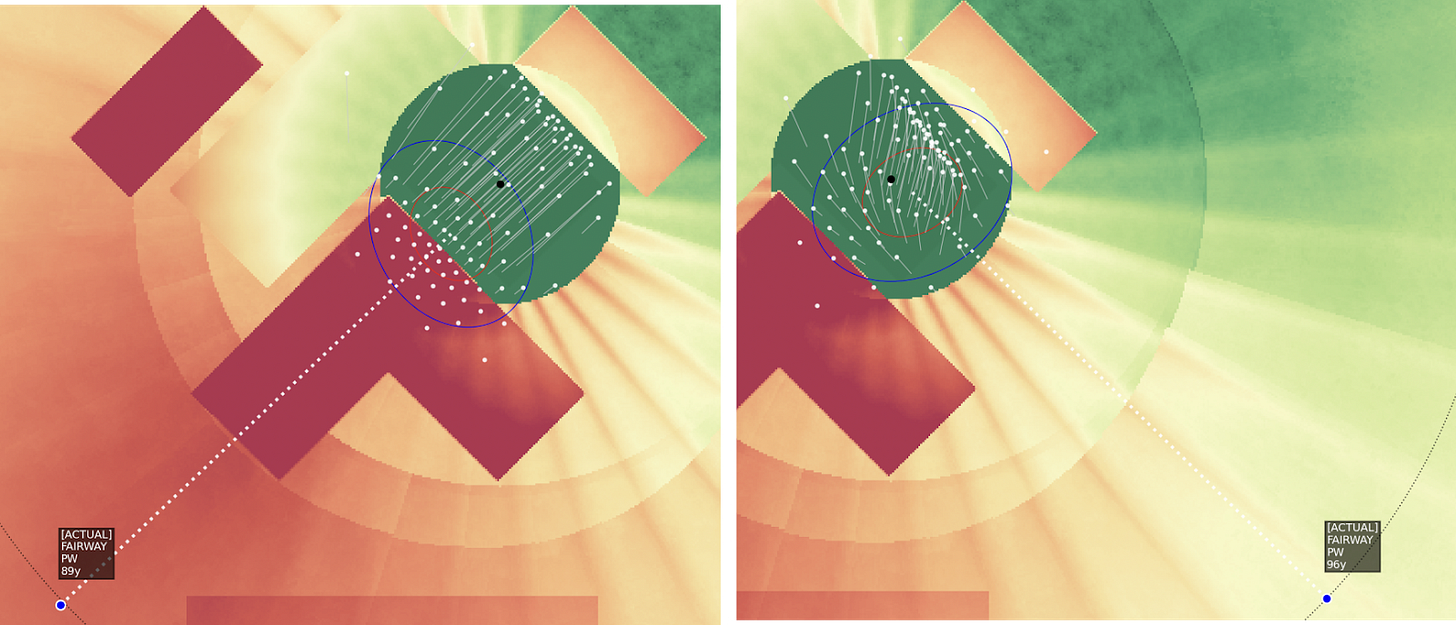 Both of these shot selections were chosen by the simulator as “optimal” because they have the lowest average strokes-to-hole of all possible angles in. So on the left, the player must try to land their shot just past the bunker in order to have a chance at a birdie putt. On the right, the player has a generous number of options for a birdie putt even with a wide dispersion pattern.