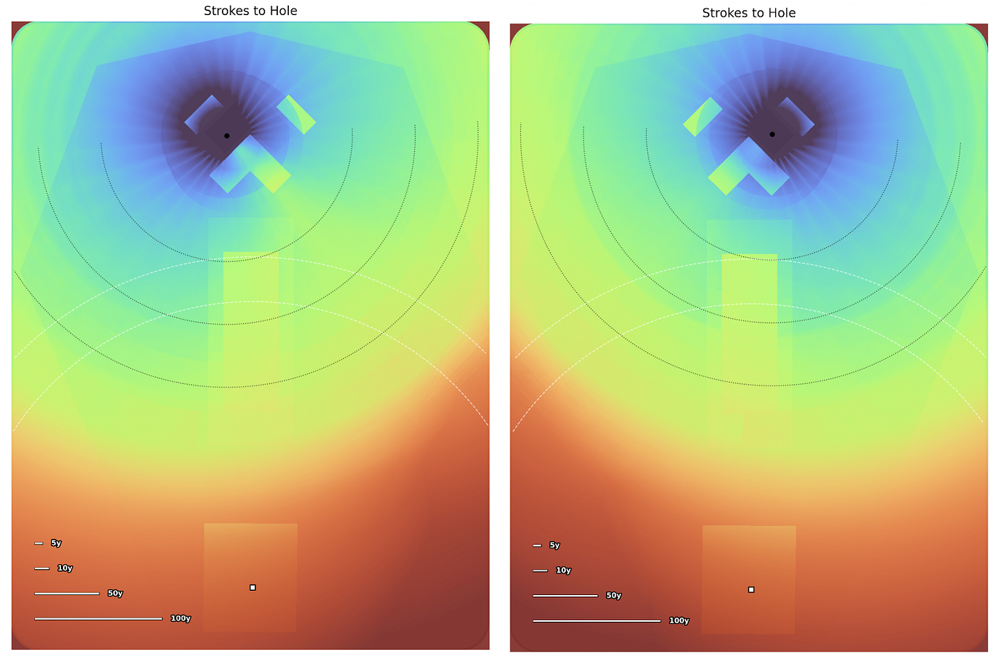 If we run the process discussed the previous article, and get strokes-to-hole heatmaps for both hole positions, we get two very different results: