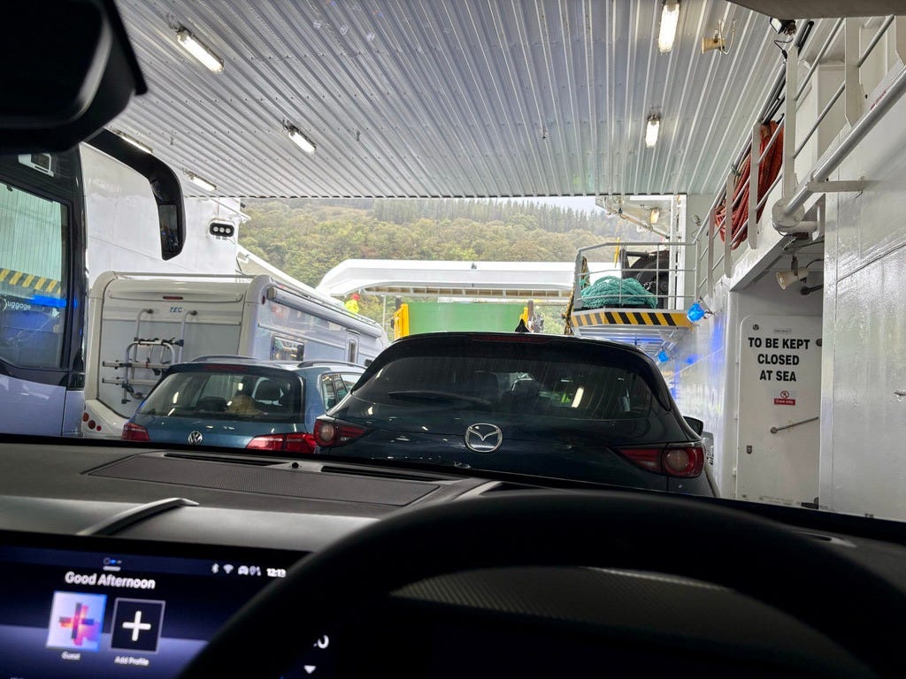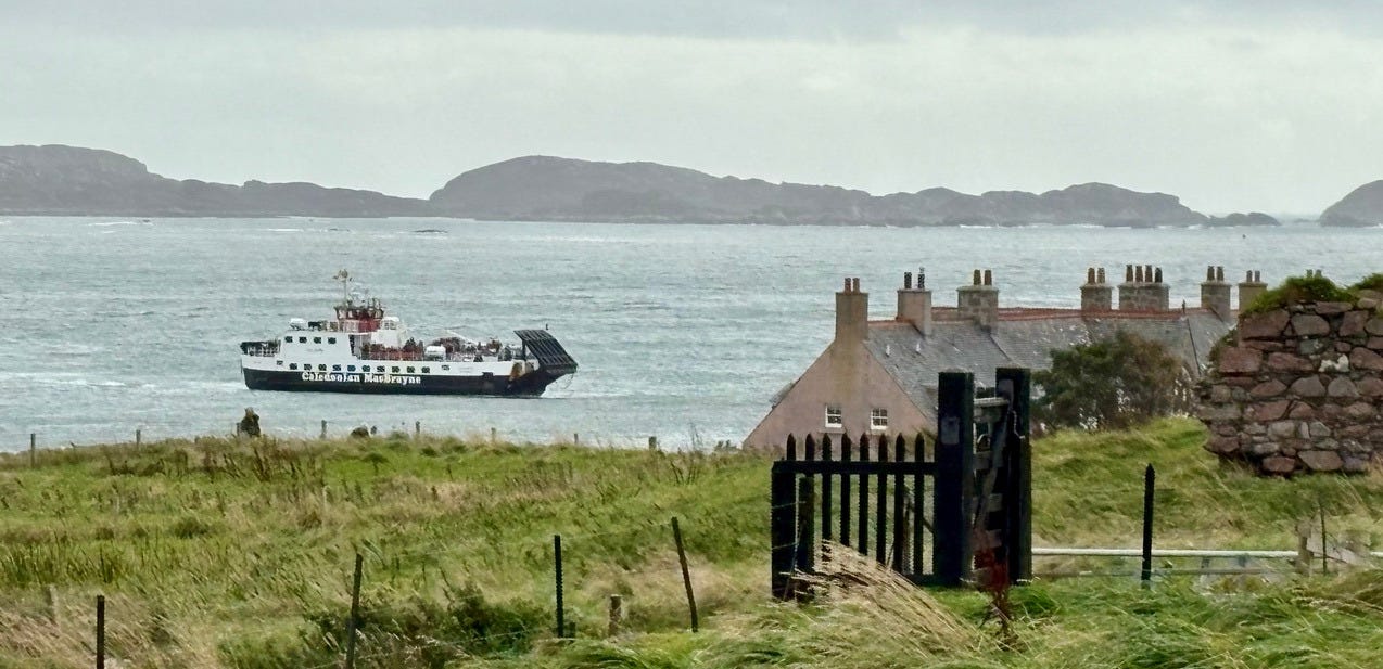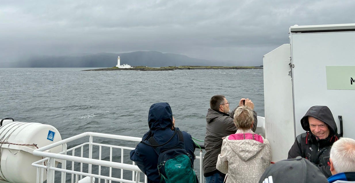 Iona is a small Scottish island off the coast of Mull, another island. To get to Iona from the closest mainland city, Oban, you have to take a ferry from Oban to a port town called Craignure on the isle of Mull, drive (or catch a bus) across that entire island to the port at Fionnphort, ditch the car, and then catch a much smaller passenger ferry from there to Iona. Because of Iona’s extremely remote location, getting there is a bit of a challenge. Apparently there used to be a more direct route, but as of 2025, the best route seems to be through Oban, so we left from there.